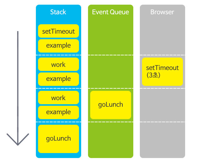 자! 이제는 앞서 봤던 예제 코드가 어떻게 수행 될지 예상할 수 있는 자신감이 생깁니다! goLunch가 3초 후에 이벤트 큐에 추가되고 실행을 기다리고 있지만 이벤트 루프가 work가 종료된 후에야 goLunch를 스택에 올릴 수 있기 때문에 3초가 지나도 “식사가시죠”가 출력되지 않는 것이었습니다.