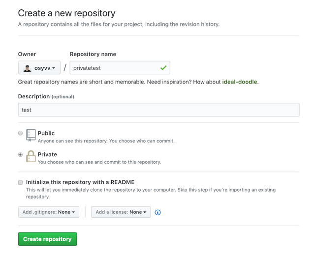 ▲바로 생성 할 수 있는 프라이빗 리포지토리. / 깃허브 갈무리